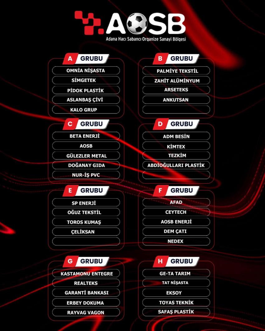 Adana Hacı Sabancı Organize Sanayi Bölgesi (AOSB) tarafından geleneksel hale getirilen ve her yıl büyük heyecanla beklenen futbol turnuvasının 11’incisi başlıyor. AOSB Seyhan Salonu’nda gerçekleştirilen kura çekimiyle 37 takımın grupları belli oldu. Turnuva bu yıl da, bölge firmaları arasındaki dostluk, dayanışma ve takım ruhunu sahaya taşıyacak.
