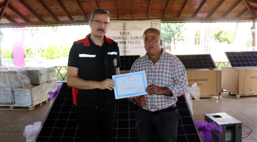 Törende konuşmaların ardından Karaisalı ilçesinden 18, Aladağ ilçesinden 10 ve Saimbeyli ilçesinden 10 olmak üzere toplam 38 göçer aileye güneş enerjisi panel sistemleri İl Müdürü Kökçüoğlu tarafından teslim edildi. Aynı ailelere önümüzdeki günlerde konaklamada kullanacakları yaşam çadırları da dağıtılacak. Her biri 510 watt gücünde olan ve 3 panel, 1 invertör ile 2 jel aküden oluşan güneş enerjisinden elektrik üreten sistemin birinin maliyeti 37.544,00 TL. Proje kapsamında üreticilere toplam 1 milyon 426 bin lira değerinde güneş paneli verildi.